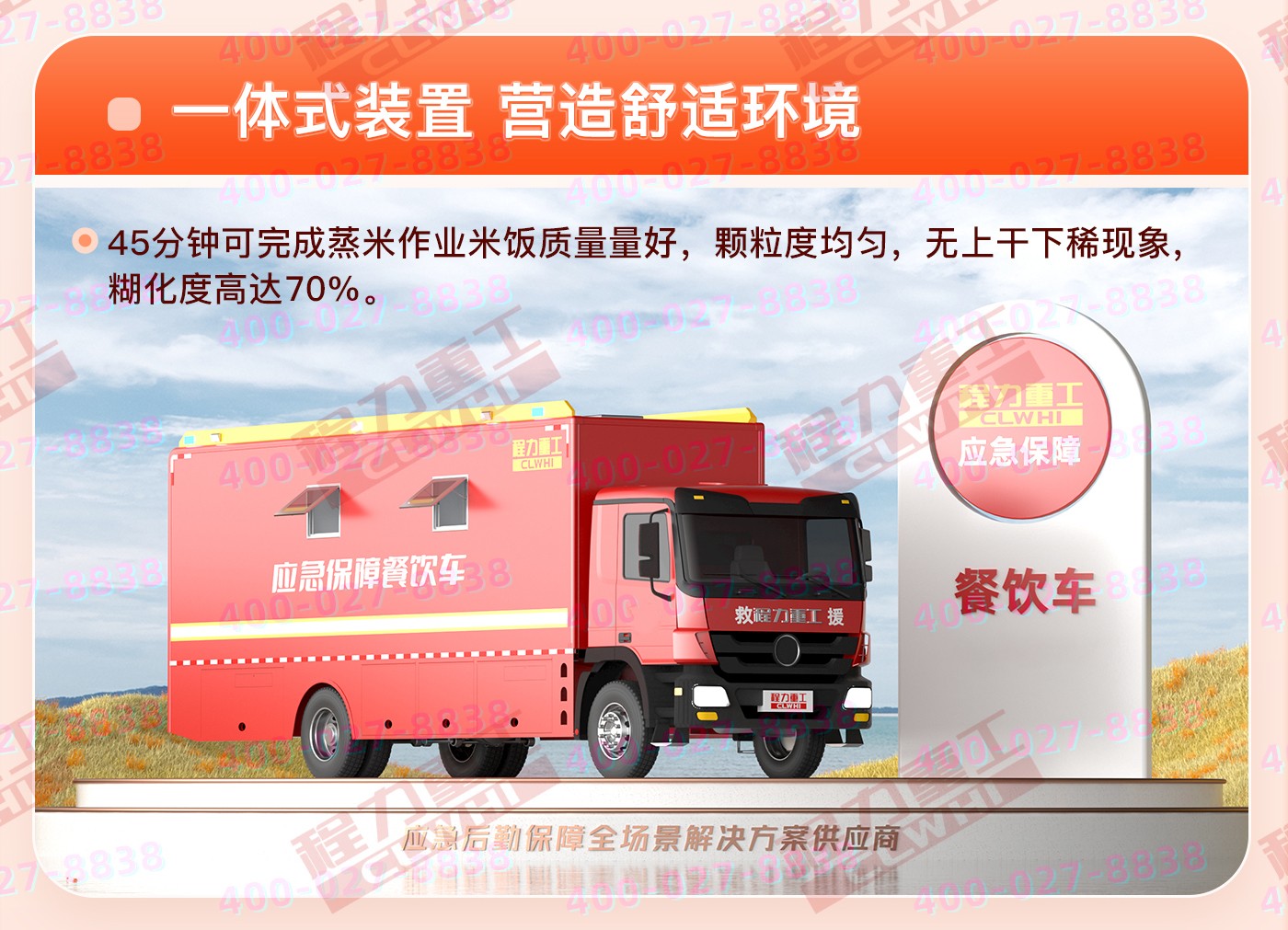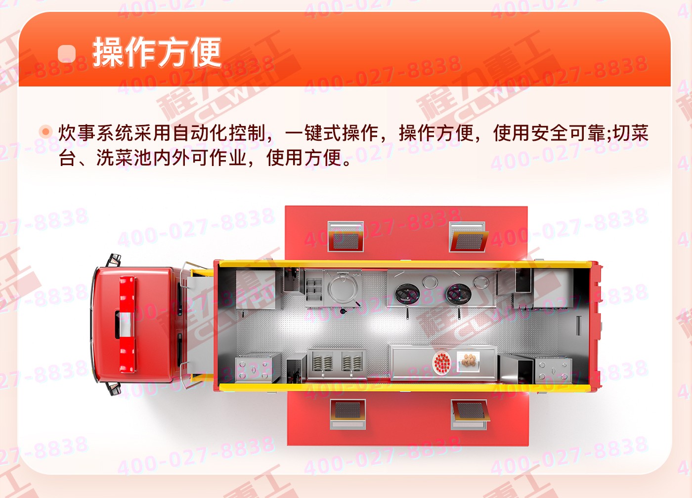 重汽汕德卡飲食保障車集爐、櫥、箱、案與一體,緊湊靈巧;實現(xiàn)了衛(wèi)生、健康、環(huán)保的要求; 功能性等集合為一體。車廂可兩邊展開作為打餐窗口;車廂內(nèi)飾為不銹鋼,配備不銹鋼爬梯、護欄、凈水箱,污水箱,雙眼灶,蒸飯車,冰箱等。不銹鋼整體壁柜,工作臺,發(fā)電機,空調(diào)等。該車機動性能好,專業(yè)性強,自動化程度高,自然環(huán)境適應性強,并能在駐車和行車時進行炊事作業(yè),可保障執(zhí)行野外任務部隊的飲食和飲水供應。